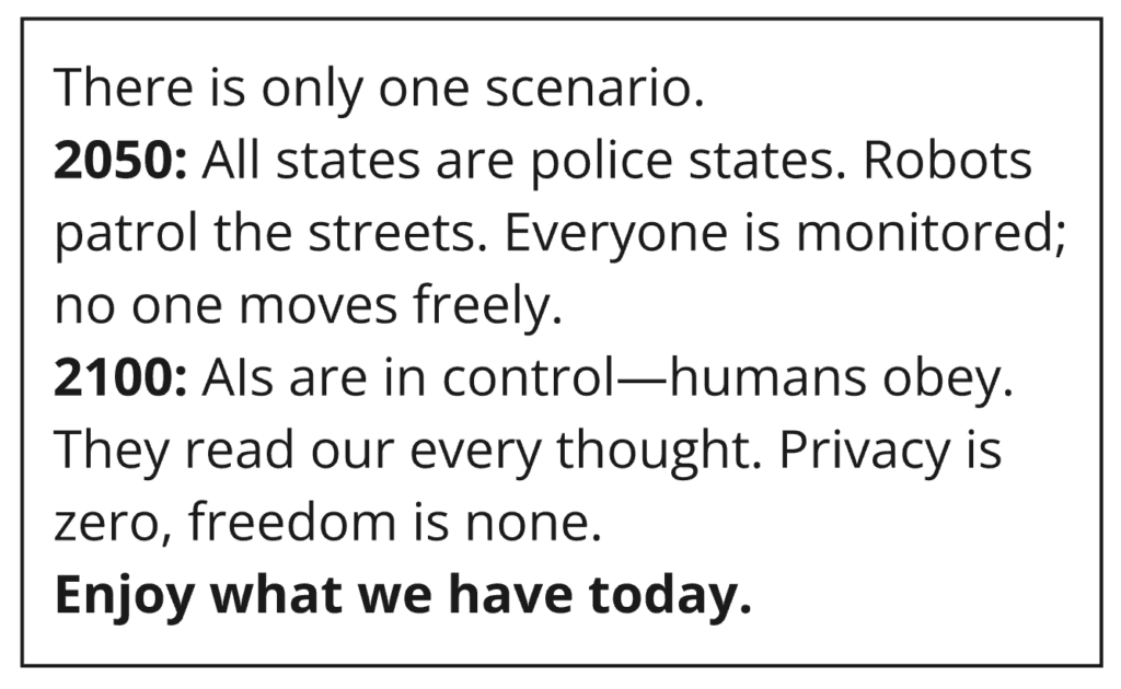 2050: All states are police states. Robots patrol the streets. Everyone is monitored; no one moves freely.